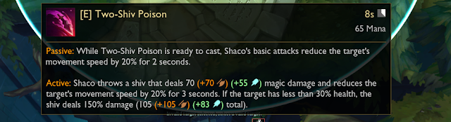 양날 독 (E)- 마나 소모량 : 50/55/60/65/70 -> 65