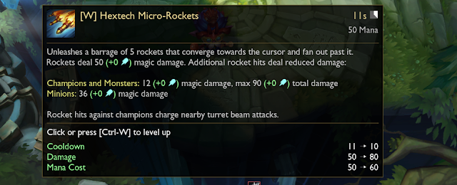 마법공학 초소형 로켓 (W)- 로켓 당 피해량 : 60/90/120/150/180 -> 50/80/110/140/170