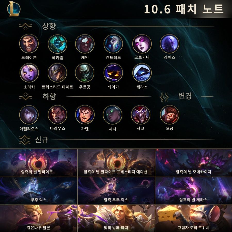 안녕하세요 토킹맨입니다. 롤에 10.6 패치노트가 찾아왔습니다. 브실골 구간에서 강력한 힘을 발휘했던 가렌과 다리우스가 칼질을 당하고 탑포지션에 대한 밸런스 조절이 있었습니다. 중요사항으로는 드디어 리메이크된 오공입니다.