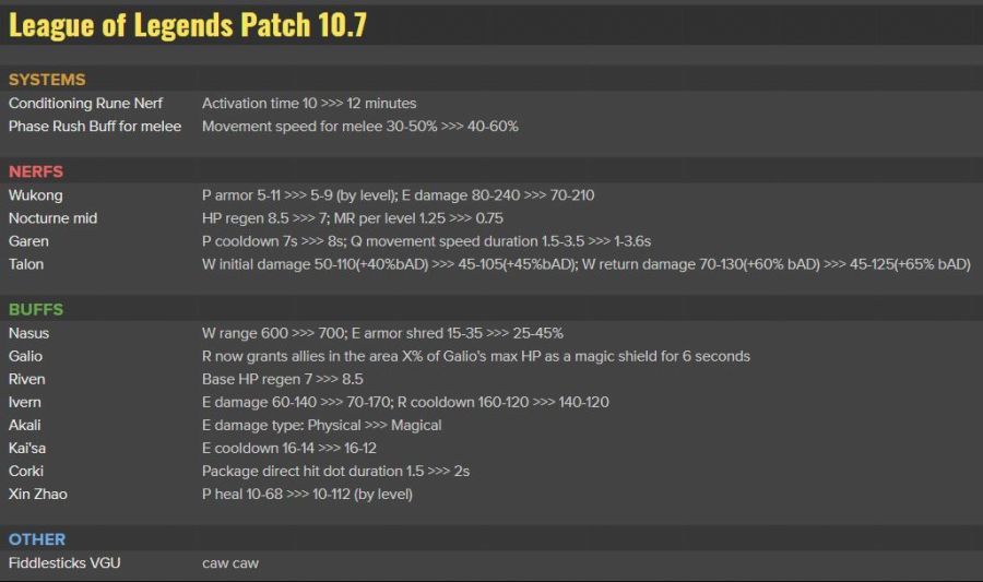 안녕하세요 토킹맨입니다. 10.7 패치가 곧 다가오는데요. 중요한 부분만 살펴보겠습니다. 너프 목록을 보시면 오공 녹턴 가렌 탈론입니다. 녹턴의 유지력을 감소시키는 패치이며 AP 메이지 상대로 나왔을 때를 저격하는 패치입니다.