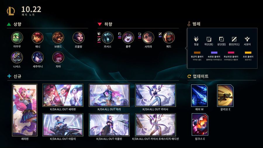 안녕하세요 토킹맨입니다. 시즌종료를 2주 남겨두고 10.22 패치가 완료되었습니다. 크게 주목할 점은 세라핀의 출시와