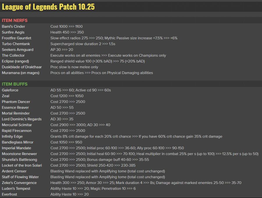 ● 원거리 챔피언 보호막 수치 100 (+30% 추가 공격력) >>> 75 (+20% 추가 공격력) (월식은 초반 핫픽스 패치이후에도 좋은 성능이라고 생각되어 계속 사용되던 템인데 이번에 한번 더 너프를 합니다. 사실 그브를 너프해야되지 않을까 싶습니다.)