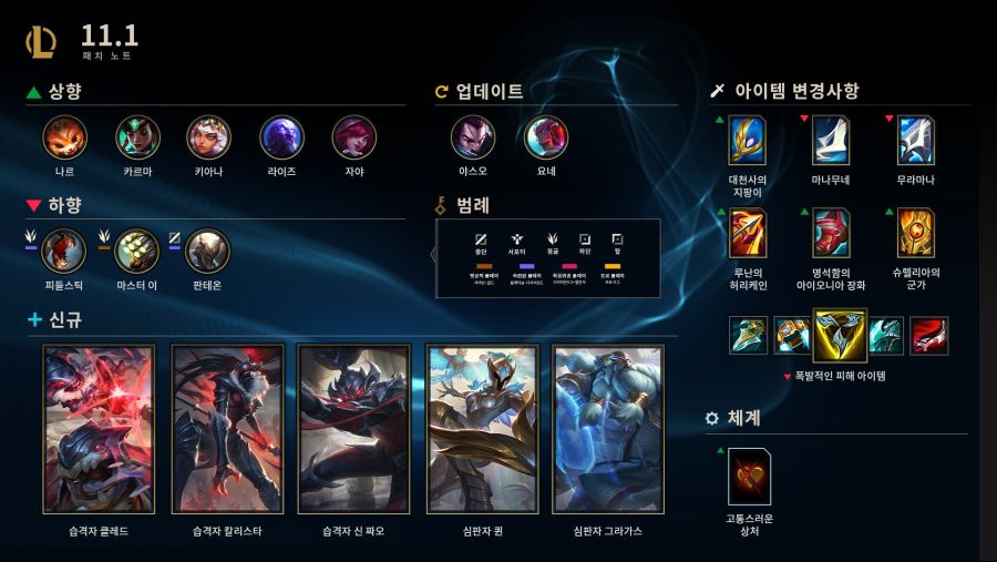 다시 한번 야스오와 요네 형제가 아이템 2개를 완성했을 때 급격히 강력해질 수 있도록 했습니다. 이제 아이템 업데이트 이전처럼 치명타 확률 100%를 확보할 수 있습니다. 0000게임 초반에 증가하는 위력에 맞춰 야스오와 요네의 전반적인 피해량을 줄였습니다. 10.25 패치에 적용된 구인수의 격노검 변경사항은 특별한 기본 지속 효과를 가진 야스오와 요네에게 다르게 적용된다는 점을 다시 알려 드립니다. 또한, 초과 치명타 확률 비례 공격력 증가 효과 툴팁을 조금 더 확인하기 쉽게 조정했습니다.