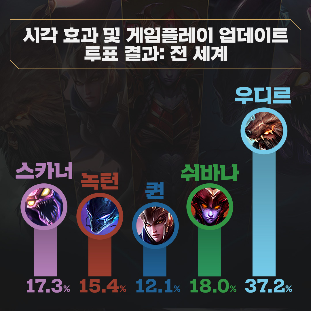 투표결과가 보여주듯 압도적인 투표수입니다. 우디르가 빛을 보자마자 리메이크가 되는 것이 아닌가 생각하실 수도 있지만 그동안 유저들의 생각은 확고하게 우디르가 리메이크 되어야 한다고 생각하는 것 같습니다. 한편으로는 리메이크 했었던 여러 챔피언들이 많은 사랑을 받았었기 때문에 제대로만 리메이크만 된다면 더욱 더 유저들에게 사랑받는 챔피언으로 변모하지 않을까 생각해봅니다.