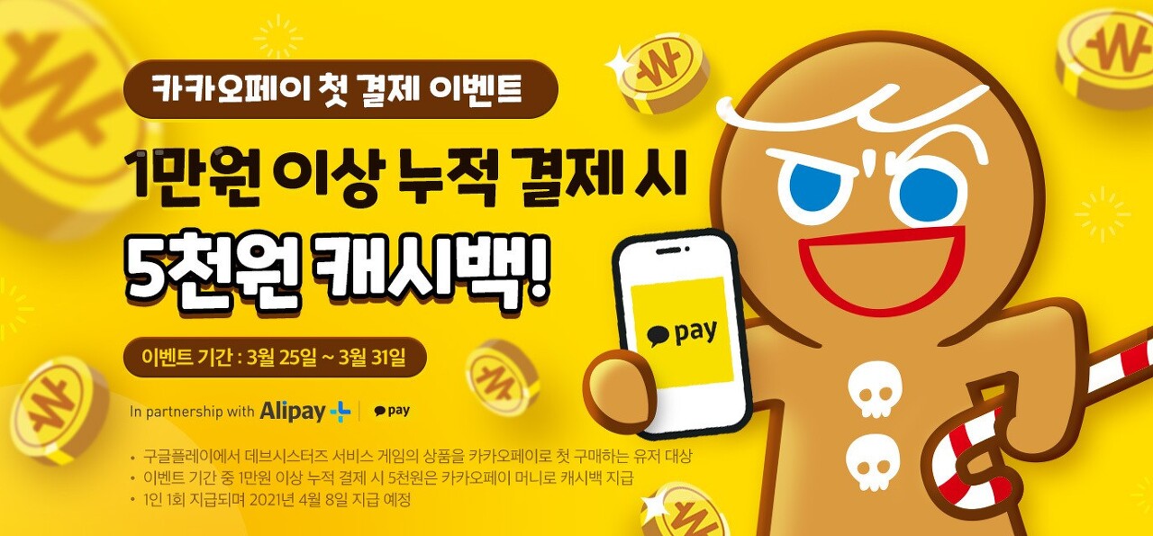 - Google Play에서 데브시스터즈 서비스 게임을 카카오페이로 첫 결제 시 대상이 됩니다.