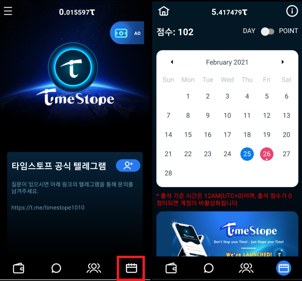 가입을 하시고 로그인 하시면 이 화면이 뜨는데 빨간색 표시된 달력을 눌러 해당 날짜를 한번만 눌러주면 자동채굴이 시작됩니다. 하루 하루 출석만 해주면 되는 시스템이며 출석을 하지 않을 시 상단에 있는 점수가 -3점씩 깎이며 점수가 다 없어지면 채굴이 불가능해집니다.