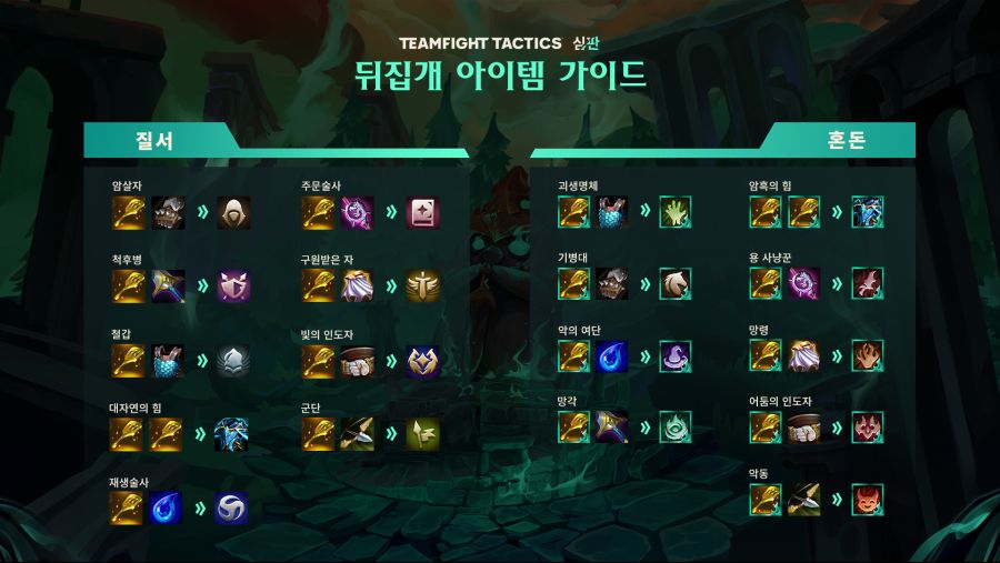 기존 세트에서는 챔피언에게 탱커 아이템을 많이 장착할수록 마나를 효율적으로 획득할 수 있었습니다. 이제 여러 개의 탱커 아이템을 장착하면 마나를 효율적으로 획득할 수 있지만 기존처럼 엄청난 양의 마나를 획득할 수는 없을 것입니다.