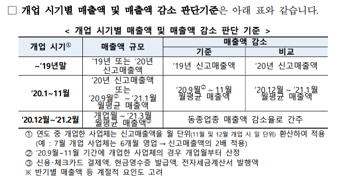 매출액 판단 기준입니다. 홈택스나 세무서를 통해서 계산된 매출액으로 판단하여 금액이 지원됩니다. 전에는 문자가 직접와서 간단하게 신청만 하면 받을 수 있는 경우도 있었지만 아닌 경우에는 확인지급을 받아야 합니다.