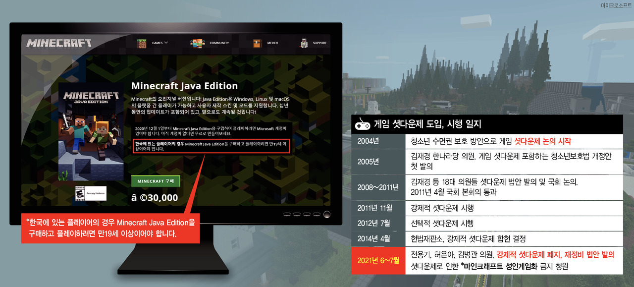 게임에 대한 중독을 막고자 하는 취지로 만든 셧다운제 하지만 이 제도가 우리나라에만 있기 때문에 마인크래프트는 셧다운제를 고려하여 우리나라에만 다른 시스템을 적용할 수 없으니 아예 19세 게임을 만들겠다고 한 것입니다.