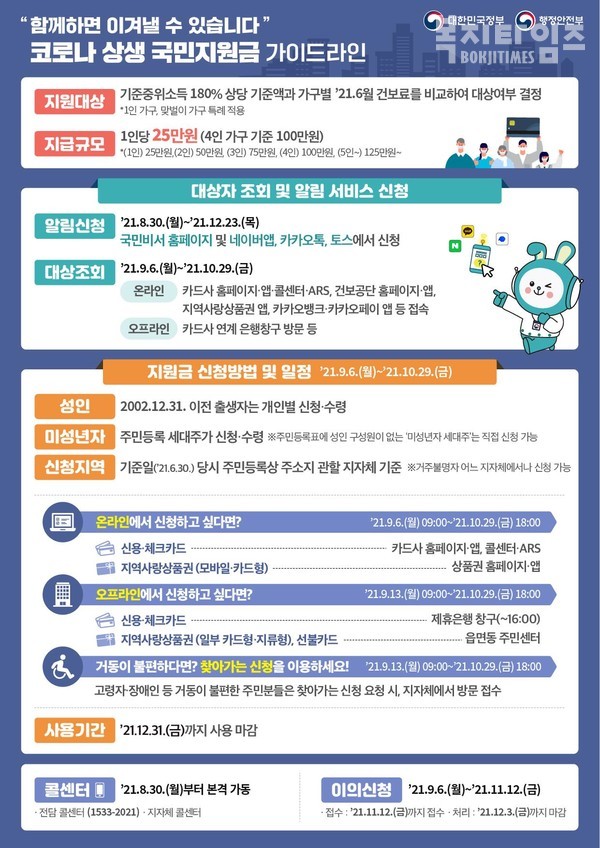미성년자는 주민등록 세대주가 대신 신청하여 수령합니다. 온라인은 카드사, 앱, 콜센터, ARS 오프라인은 사용하시는 은행 및 지역사랑 상품권은 지역 주민센터로 방문하셔서 받으시면 됩니다.