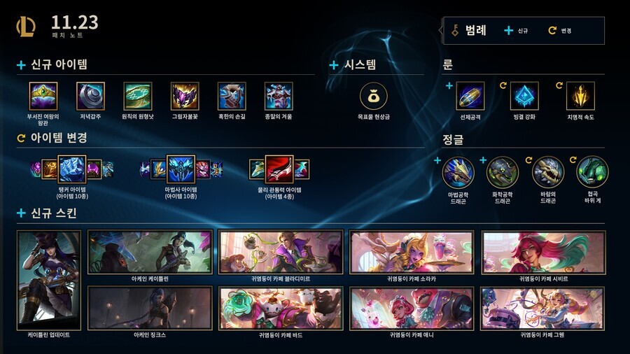 귀염둥이 카페 그웬, 귀염둥이 카페 소라카, 귀염둥이 카페 애니, 귀염둥이 카페 바드, 귀염둥이 카페 시비르, 귀염둥이 카페 블라디미르가 이번 패치 기간에 상점에서 판매됩니다. 2021년 11월 23일부터 아케인 케이틀린, 11월 25일부터 아케인 징크스를 한정된 기간 동안 획득하실 수 있습니다.