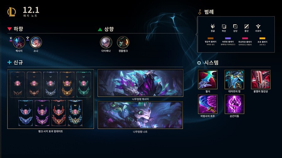 나무정령 나르, 나무정령 렉사이가 이번 패치 기간에 상점에서 판매됩니다.(원래라면 스킨을 위해 상향을 하고 스킨을 팔아먹는 구조가 많았었는데 이번 패치팀은 스킨은 스킨이고 밸런스는 밸런스이다 이런 방향성이 잡혀 있는 것 같습니다.)