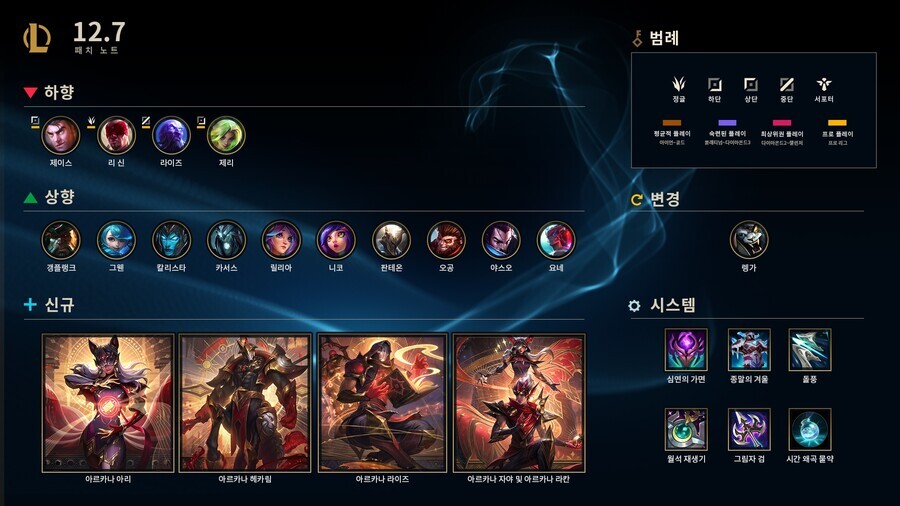 12.7 패치에서는 판테온, 오공 등 위력이 부족한 챔피언을 상향하고 돌풍이나 혹한의 손길처럼 강력한 아이템을 하향했습니다. 다른 세계에서 찾아온 아르카나 스킨도 만나볼 수 있죠!