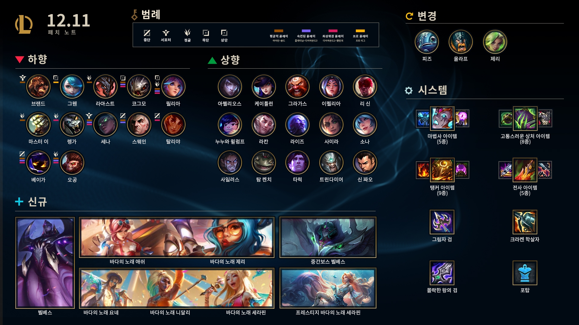 각 신화급 주문력 아이템의 위력을 비슷한 수준으로 맞추기 위해 모든 아이템을 전체적으로 조정했습니다. 특히 내구력 업데이트 이후 교전 시간이 길어져 리안드리의 고뇌와 균열 생성기의 위력이 증가했으며 만년서리는 꾸준히 좋은 모습을 보여주고 있습니다. 반대로 이전부터 약한 모습을 보인 부서진 여왕의 왕관은 12.10 패치 이후 위력이 더욱 감소했습니다. 마지막으로 주문력 암살자들이 밤의 수확자를 더 자주 사용할 수 있도록 약간 상향했습니다.