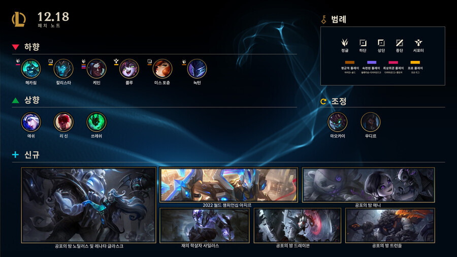 재의 학살자 사일러스, 공포의 밤 애니, 공포의 밤 드레이븐, 공포의 밤 노틸러스, 공포의 밤 레나타 글라스크, 공포의 밤 트런들, 공포의 밤 우르곳, 2022 월드 챔피언십 아지르가 이번 패치 기간에 출시됩니다.