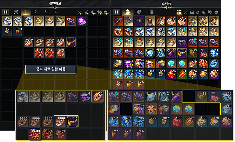 아이템 창고 이동시 중복재료를 일괄이동하는 편리한 기능이 생겼습니다.