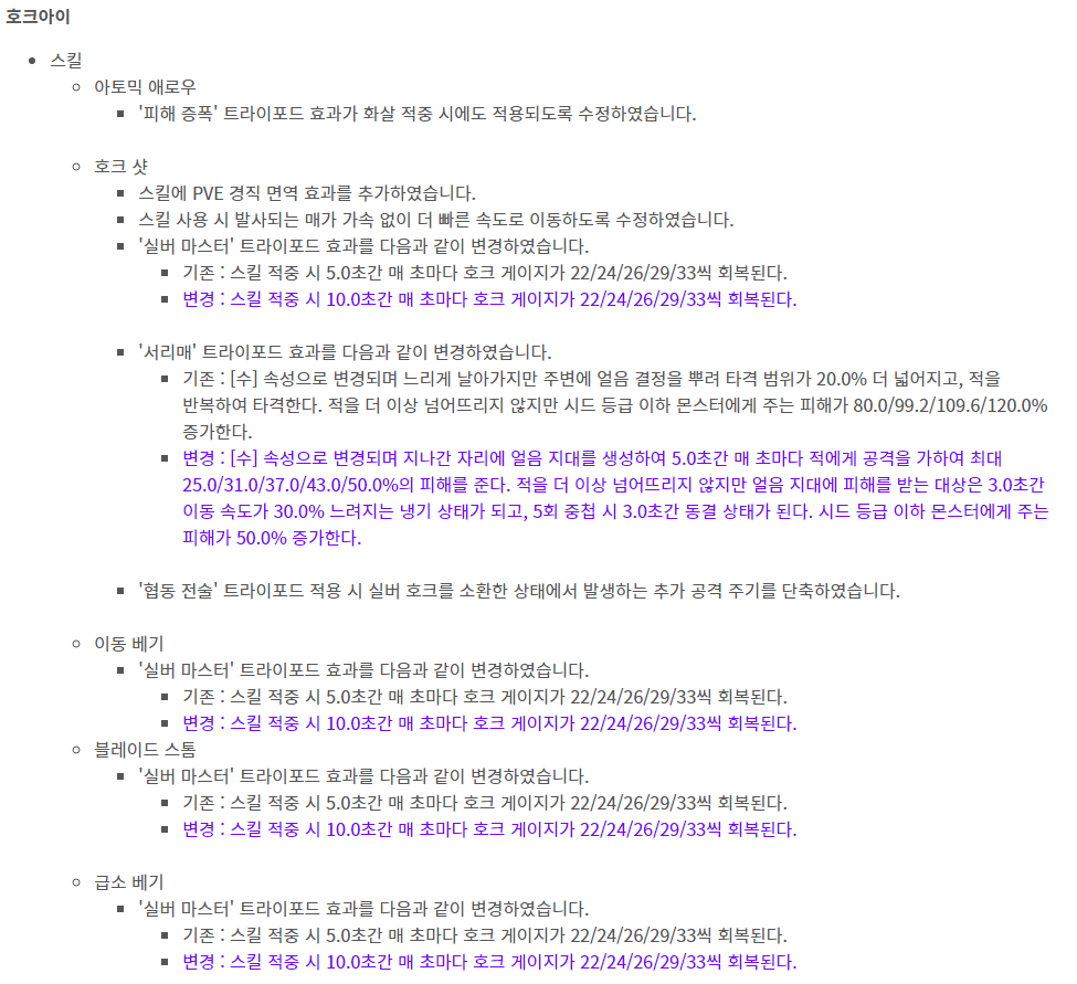 대망의 호크아이입니다. 호크아이는 일단 특성 자체가 바뀌어서 혼란을 가지고 있는데 특성이 바뀌어서 더 좋은 모습으로 바뀐다면 호크아이 유저분들도 어느정도는 감수하고 세팅을 바꾸지 않을까 했는데 지금까지 패치된 내용을 보면은 호크를 어떤 방향성으로 패치를 해야 되는지 전혀 감을 잡고 있지 못하는 모습입니다. AS 패치만을 기다렸던 많은 호크유저분들은 장례식 분위기가 형성되었고 실제로 별등섬에 찾아 아이템을 파괴하시는 분들도 있었습니다.