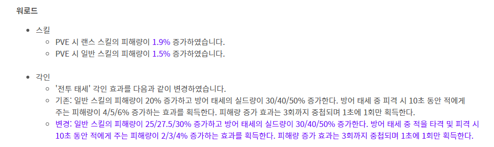 워로드는 스킬 피해량이 증가하였고 전투태세 각인의 변경되었는데 이게 피격시에만 피해량 증가 효과가 중첩되었는데 적을 타격이라는 멘트가 추가되면서 3 중첩이 쉬워졌습니다. 하지만 전투태세 1을 써서 피해량 12% 를 유지했던 고기로드(고독한 기사)한테는 피해량이 6%로 감소하는 결과가 되었습니다. 고기로드한테는 아쉬운 부분이고 전대로드도 원래는 효율을 위해 각인을 1 각인만 채용했었는데 3각인을 고려할 수 있는 각인이 되었습니다.