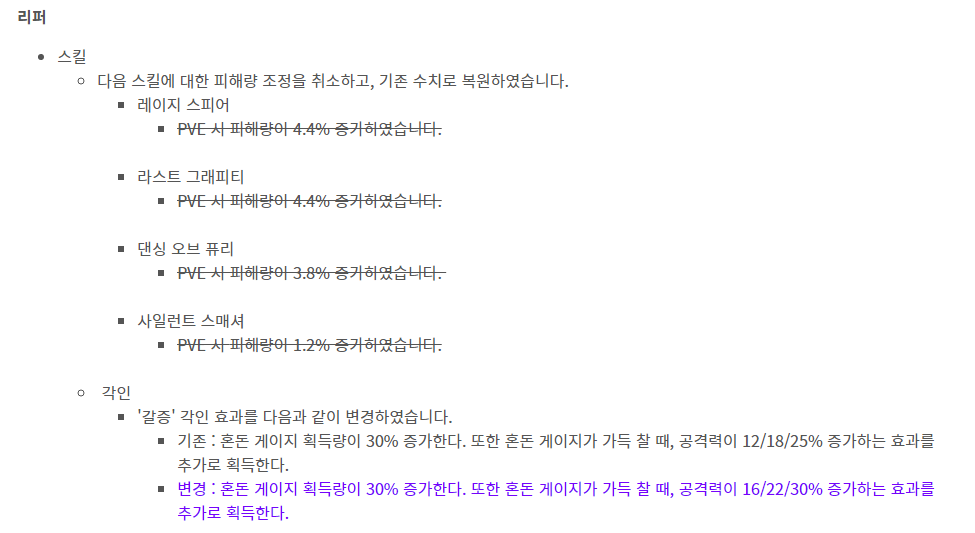 리퍼는 스킬들의 데미지 증가를 다시 롤백했습니다. 스마게의 내부데이터가 어떤지는 모르겠지만 150일을 넘게 쌓아온 내부데이터를 기반으로 한 패치내용이 테스트 서버에서 루메루스를 몇 번 쳐보는 걸로 손바닥 뒤집듯이 된다는 게 이해가 안 갑니다. 이런 패치가 계속될수록 스마게의 밸패 및 내부데이터에 대한 활용 능력이 없다고 판단됩니다.