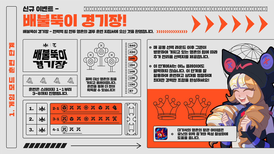 배불뚝이 경기장은 모바일에서 모든 콘텐츠를 체험할 수 있는 전략적 팀 전투 최초의 이벤트입니다. 배불뚝이 경기장에서는 자신만의 여정을 떠나는 소울 파이터 챔피언들과 해당 챔피언들의 개인 트레이너(꼬마 전설이)를 만나실 수 있습니다.