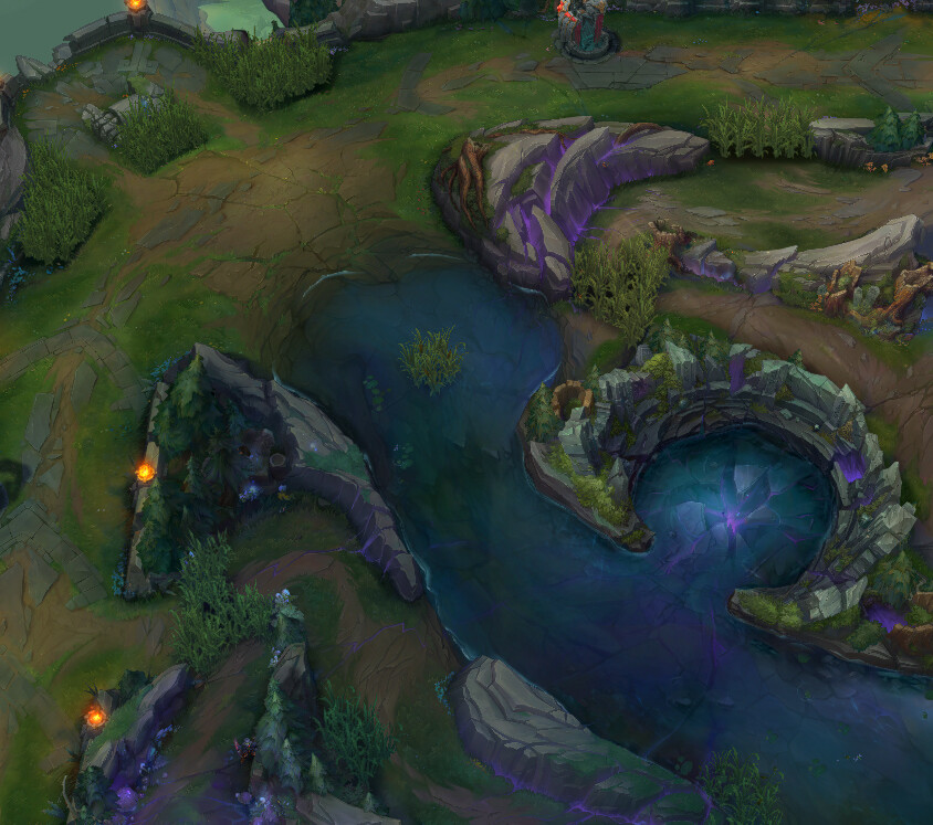 이번 변경을 통해 게임 초반에 상단 공격로에 대한 다른 공격로의 영향력을 대폭 줄여서 일대일 싸움을 제대로 부각하고자 합니다. 정글러 개입의 여지가 아예 사라지지는 않았으니 여전히 조심할 필요는 있습니다. 또한 강가의 수풀을 1칸으로 바꾸고 강의 중앙으로 옮겨서 진영 간 불균형을 줄이고 수풀을 확보하면 훨씬 더 큰 영향력을 발휘하게 했습니다. 라이브 서버에서는 강가 수풀 밖에 와드를 설치하는 편이 좋으며 여전히 어느 정도 맞는 말이기는 하지만, 새로운 수풀은 최적의 와드 설치 위치에 더 가까우며 이로 인해 이전보다 공격로 개입 가능성이 줄어듭니다.