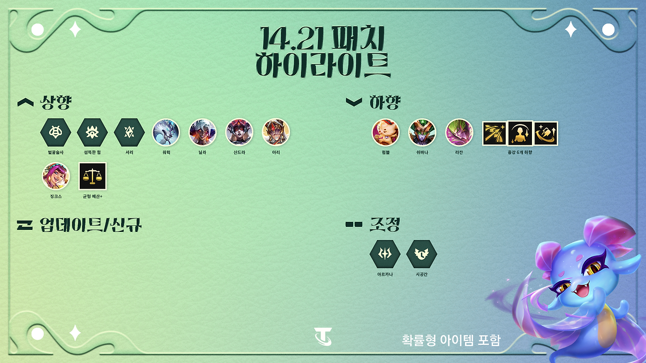 14.20 패치에서는 요술사가 매우 강력한 모습을 보였지만, 몇 시간 내로 추가 패치를 통해 아주 약간만 적정선을 넘도록 조정했습니다. 스킬을 두 번 사용하는 건 매우 재미있기에, 드디어 쓸만한 요술사용 빌드 경로가 발견된 것은 매우 기쁘지만 이 조합의 가장 강력한 지점인 (7) 요술사는 소폭 하향했습니다.