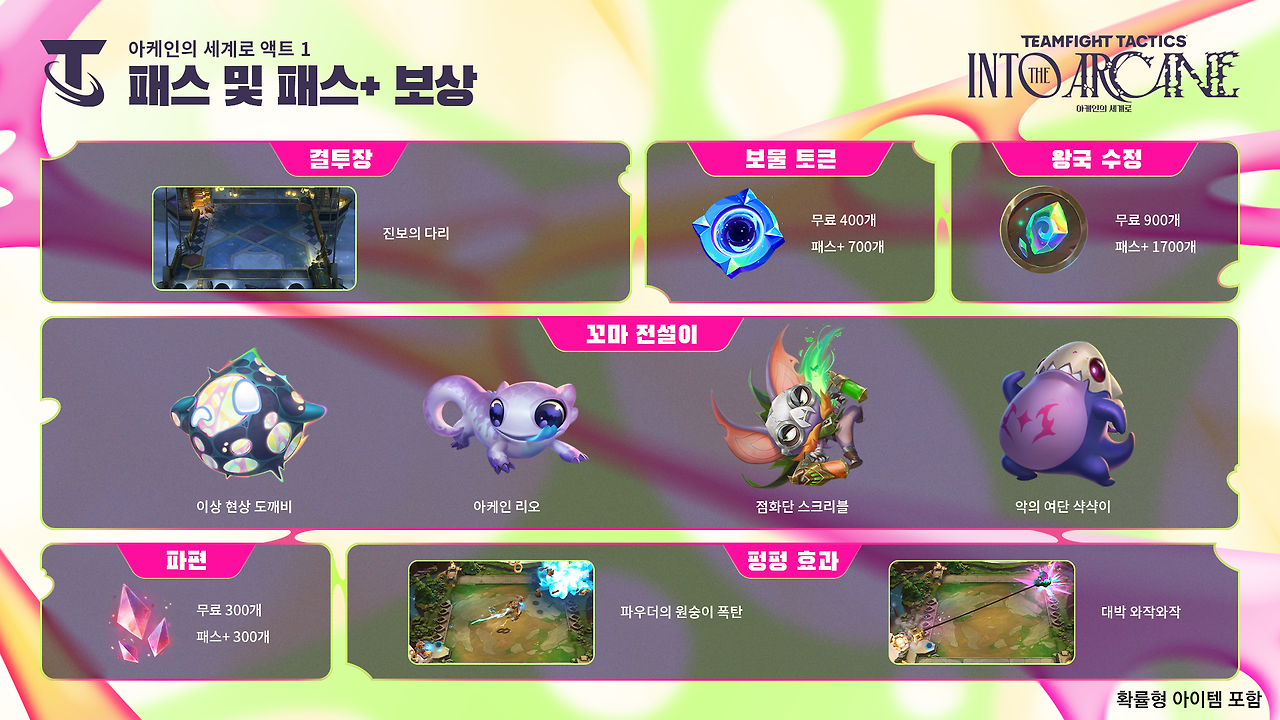 다른 장식 요소는 아케인의 세계로가 출시될 때 만나보실 수 있지만, 패스는 출시일보다 조금 늦은 11월 21일 4:00에 활성화됩니다. 패스+의 첫 챕터에 관한 자세한 내용은 아케인의 세계로 장식 콘텐츠 문서를 확인해 주세요!