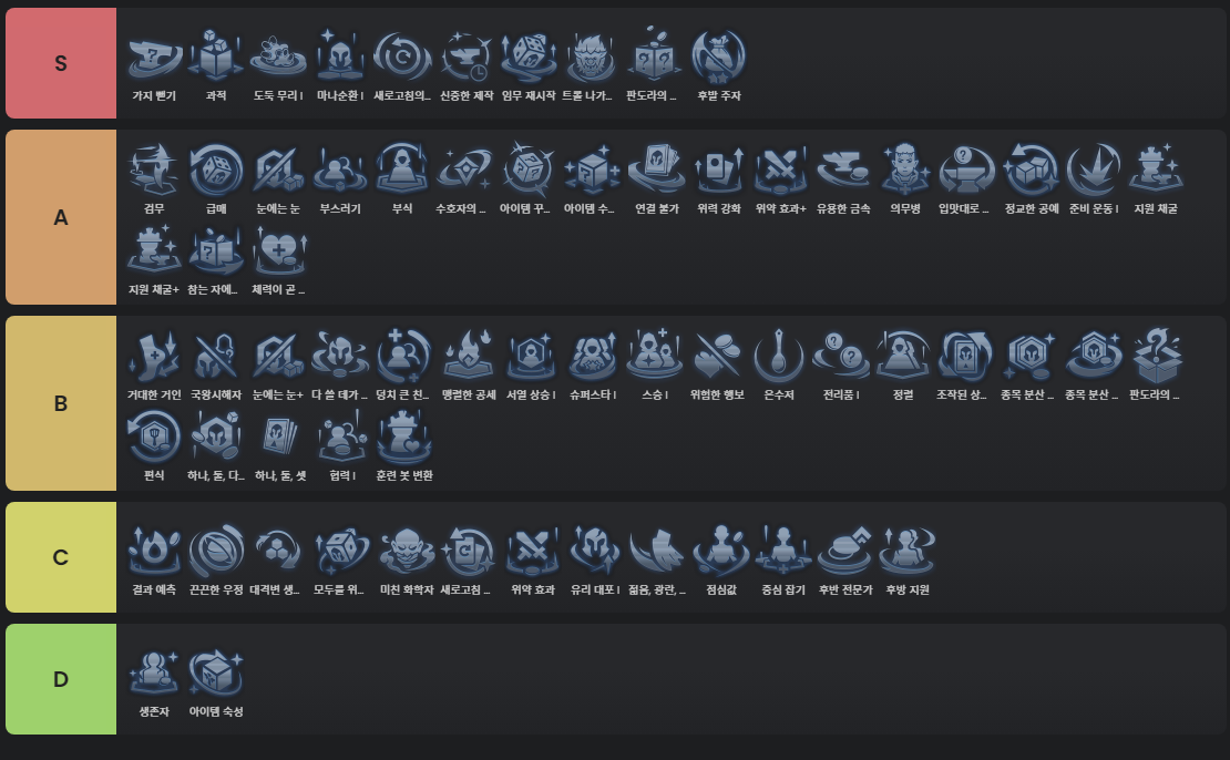 마지막 기회 - 처음 사망 시 최대체력으로 부활, 공속 50%, 피흡 20% 증가 하지만 매초 12.5% 체력소진
