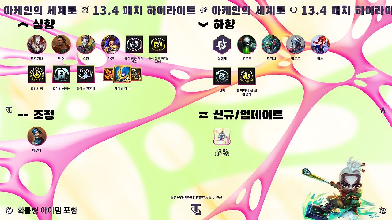 - 금단의 마법: 중첩 획득에 필요한 처치 관여 횟수: 3 ⇒ 2, 중첩당 공격력: 1.5% ⇒ 2%