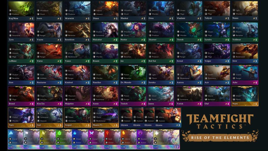 - 럭스(원소술사 럭스, (원소*), 아바타): 럭스가 원소를 발사하여 일직선상에 있는 모든 적에게 500/800/1100의 마법 피해를 입힙니다. 최후의 섬광으로 최소 하나의 대상을 처치하면 50의 마나를 돌려받습니다.