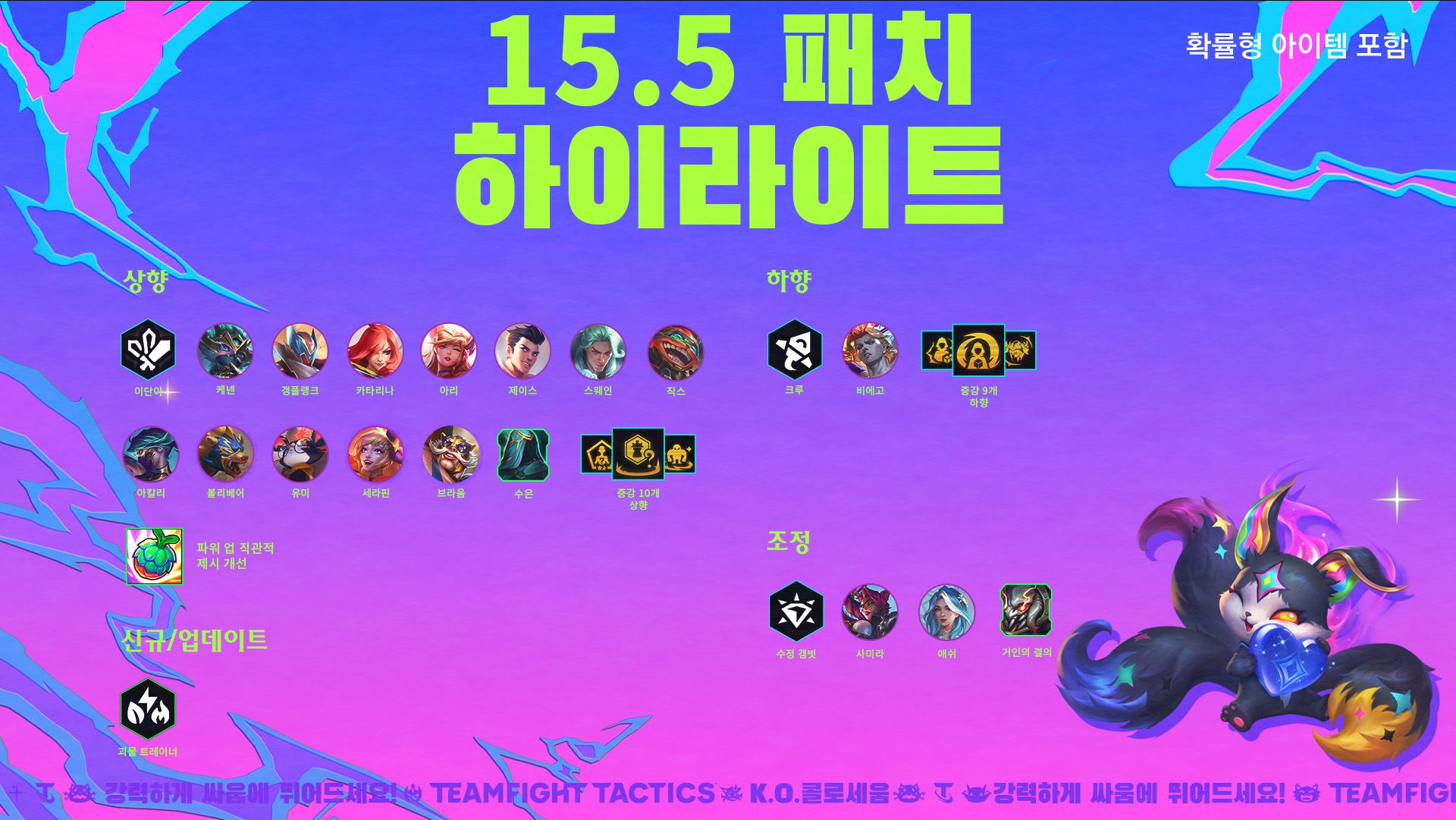 - 완전체 (자크) 강화 스킬 피해량: 주문력 130/195/295+체력 12% ⇒ 주문력 100/150/225+체력 10%