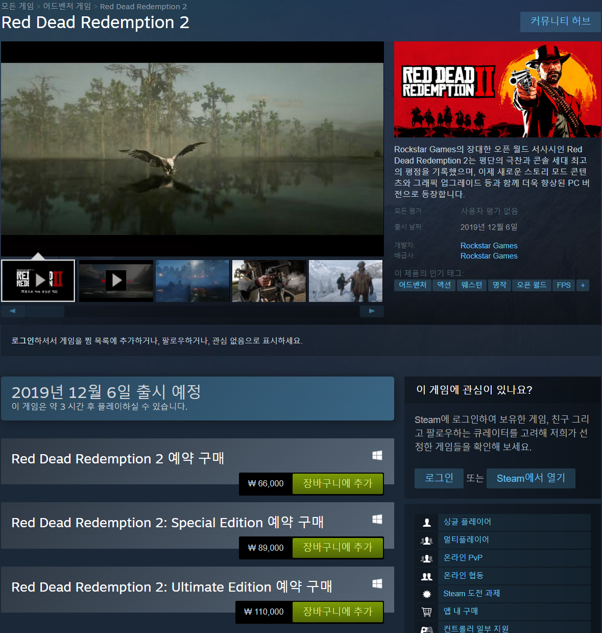 안녕하세요 토킹맨입니다. 레드데드리뎀션2가 스팀 상점에 개시가 되었습니다.
